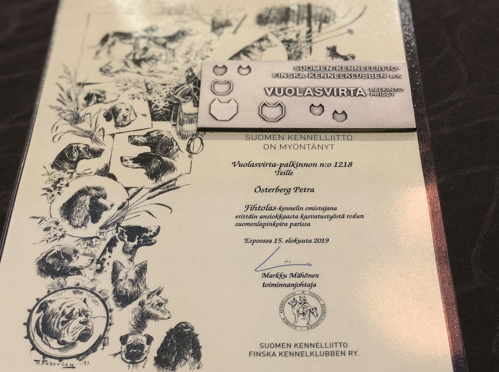 In the year 2019 I was granted the Vuolasvirta award, which is the highest merit a breeder can get by the Finnish Kennel Club.